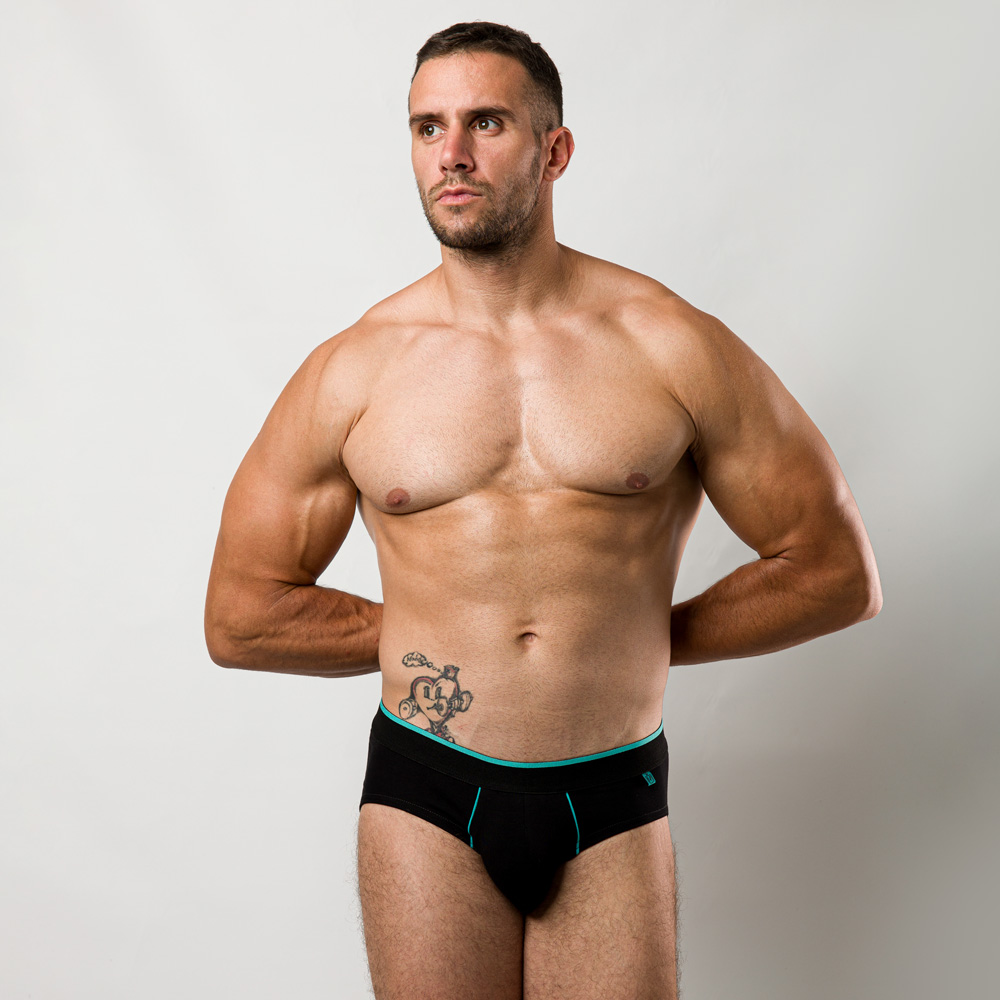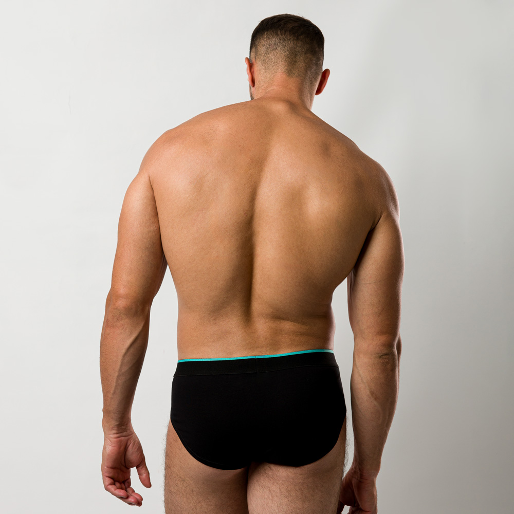Crni slip anatomskog kroja je izrađen od ultra-soft organskog pamuka sa malim dodatkom elastina koji omugućava rastegljivost i maksimalnu udobnost. Lastiš je širine 35mm sa mint detaljima. Na levoj strani slipa nalazi se crno-mint Manor logotip. Crni slip anatomskog kroja ima elastične delove na nogavicama koji sprečavaju povlačenje bokserica na gore, pružajući ti celodnevnu sigurnost ispod pojasa i nesmetano kretanje.